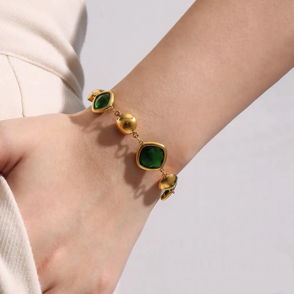 Crafted with meticulous attention, the Emerelle bracelet combines lustrous gold beads with striking emerald green stones, creating a sophisticated accessory that enhances any outfit. Its balanced design offers both elegance and durability, making it ideal for daily wear or special occasions. The rich emerald tones bring a subtle vibrance, while the gold beads add timeless warmth, resulting in a refined piece that complements a discerning style.
