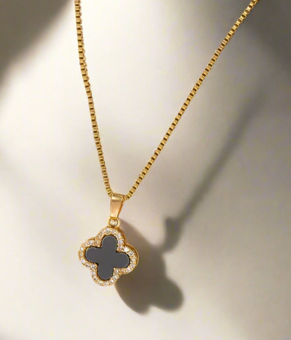The Noir Clover pendant necklace features a meticulously crafted four-leaf clover design, symbolizing luck and prosperity. Its sleek, modern silhouette is perfect for layering or wearing alone as a subtle statement piece. Expertly made with durable materials, this necklace offers both style and lasting wearability, making it an elegant addition to any jewelry collection.