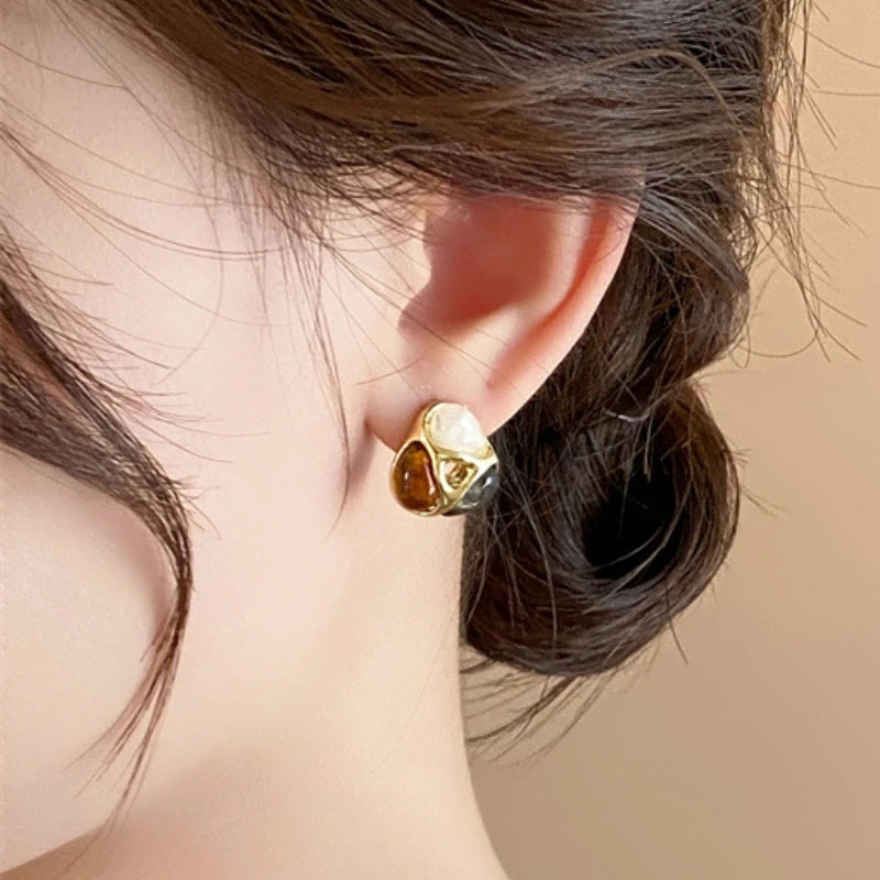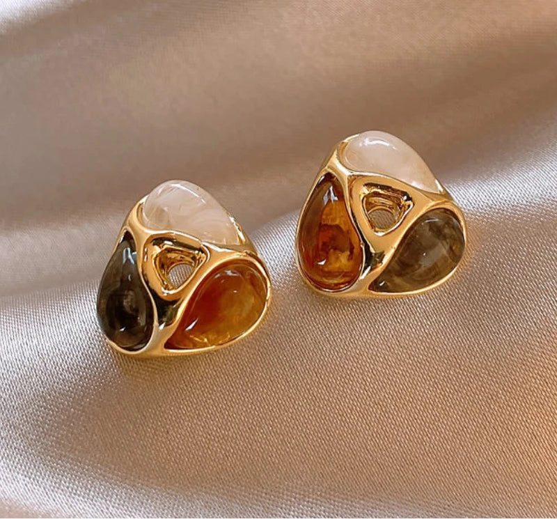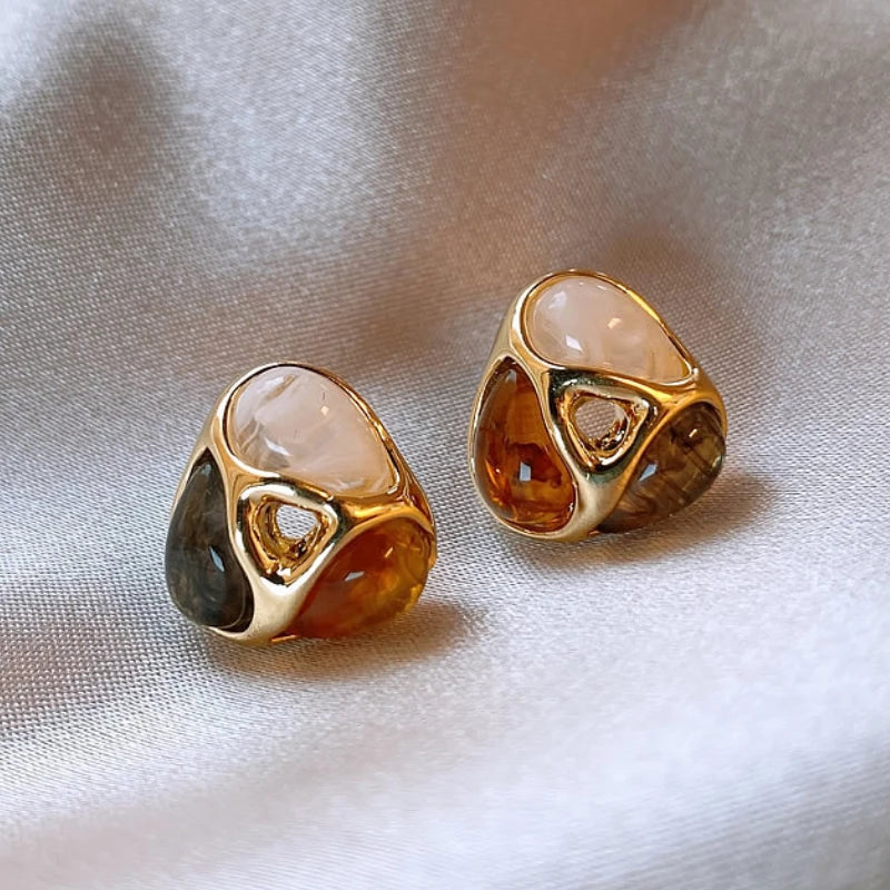 The Trevia stud earring showcases a sophisticated blend of three earth tone colors, elegantly framed by a delicate gold setting. This design offers a subtle yet refined touch, perfect for enhancing both casual and formal looks with an expert sense of style. Crafted to highlight natural hues, Trevia complements a wide range of outfits while maintaining a timeless appeal.